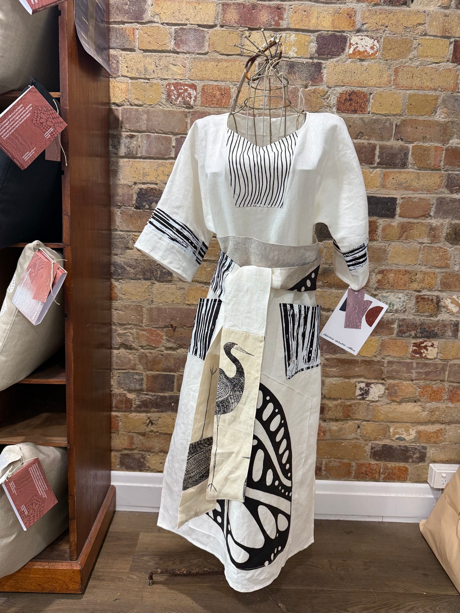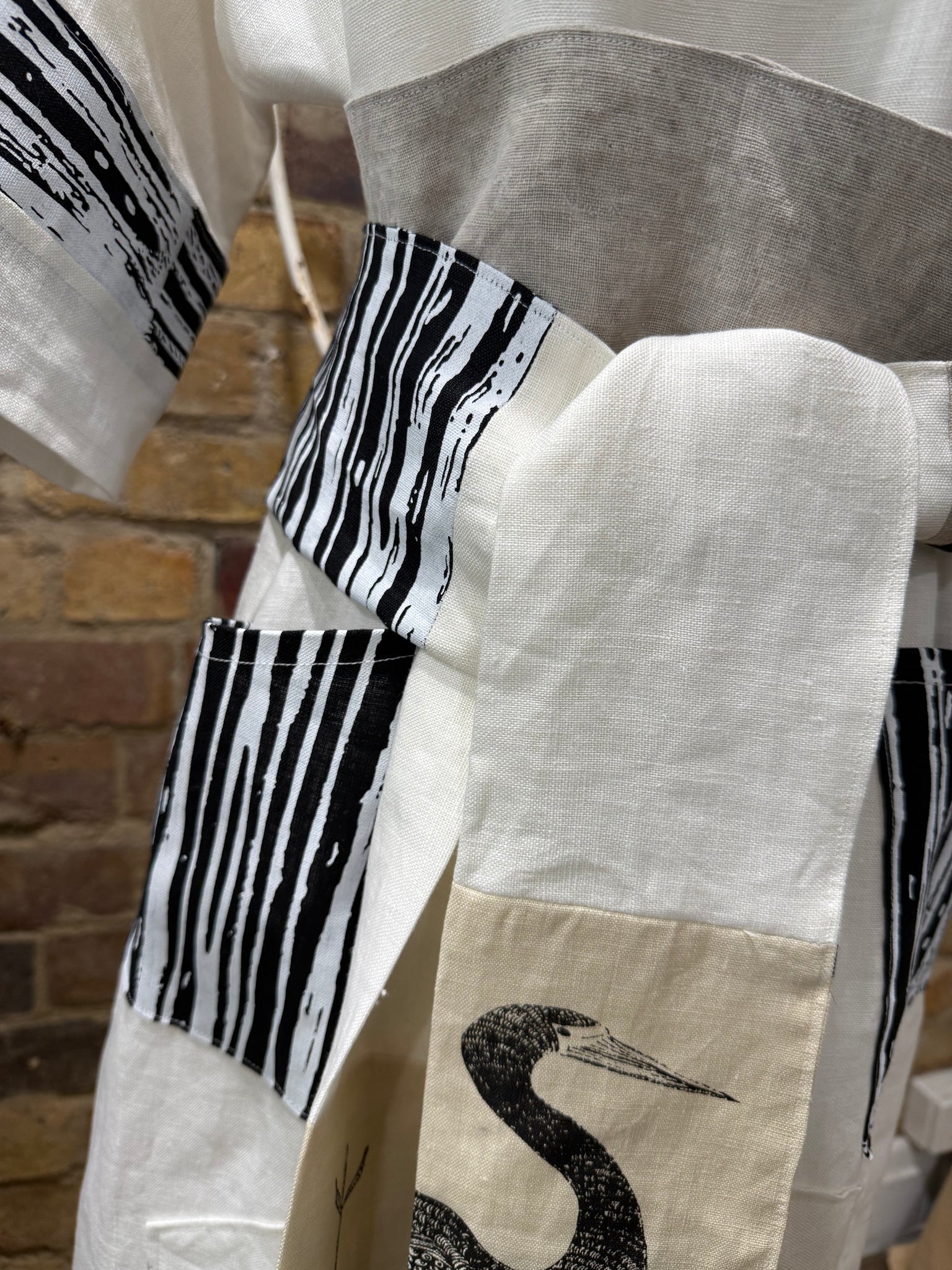 This one of a kind linen dress has a selection of printed and dyed fabrics in panels, pockets and across the sash